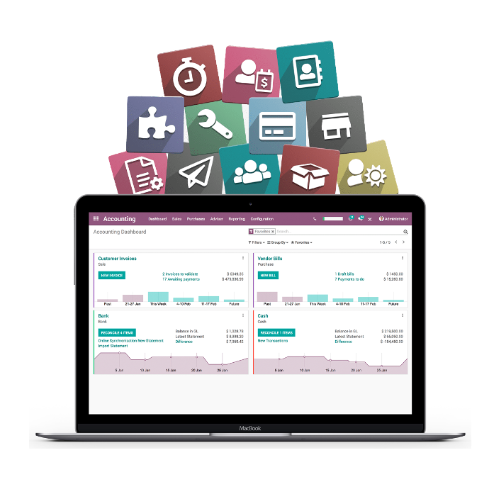 Manage sales, purchases, inventory, accounting, and more from a single platform.